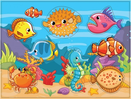 Ogni forma del puzzle corrisponde al proprio incavo. Durante il gioco i bambini consolidano la conoscenza di colori, forme e nomi degli animali del mondo sottomarino.