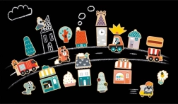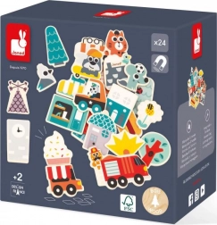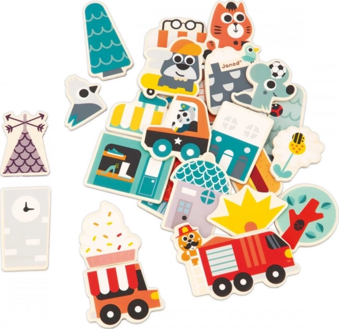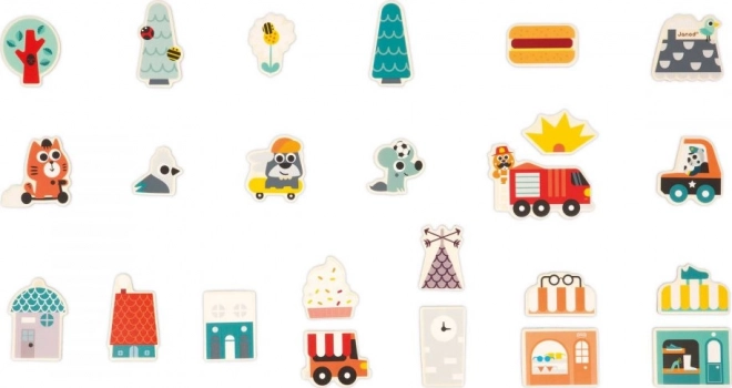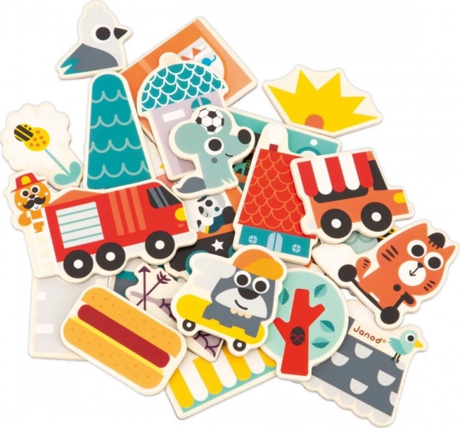 Con questo set di 24 magneti in legno puoi costruire su tutte le superfici magnetiche! Il set di magneti per bambini include, oltre al monopattino e allo skateboard, anche magneti con veicoli (autopompa, auto della polizia, food truck) e elementi necessari per creare negozi, case e far fiorire questa città abitata da allegri animaletti. I magneti possono essere combinati tra loro per creare molte diverse combinazioni.