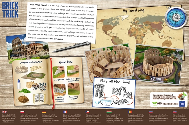 Scopri l’atmosfera dell’antica Roma e crea il tuo modello del famoso Colosseo. Il set TREFL BRICK TRICK Travel unisce materiali autentici e un divertente approccio educativo alla costruzione. Passo dopo passo posi mattone su mattone, tagli e incolli gli elementi in legno e completi il modello con le decorazioni incluse.