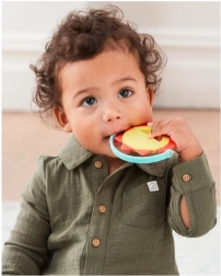 Un tenero massaggiagengive a forma di sole che aiuta durante la fase di dentizione. Il morbido materiale in silicone ha una texture adatta da mordere e allo stesso tempo intrattiene il bambino. La forma, facile da afferrare, include anche un anello mobile che le piccole manine possono esplorare.