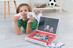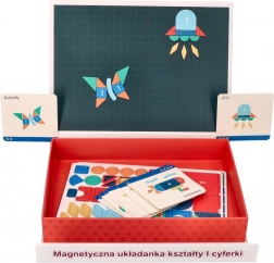 Nella confezione sono incluse 20 carte con modelli a difficoltà progressiva, che guidano i bambini passo dopo passo nella composizione. La lavagna magnetica con righe (26 × 19 cm) aiuta a mantenere ordine e precisione. Il giocattolo è realizzato con materiali sicuri e rispetta gli standard CE.