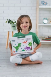 Contenuto della confezione: lavagna magnetica 26 × 19 cm, 10 carte colorate con illustrazioni e nomi dei dinosauri e 51 pezzi magnetici per il montaggio. Il prodotto è realizzato con materiali sicuri e conforme agli standard CE.