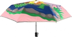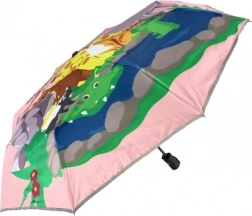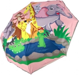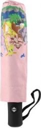 L'ombrello ha una stampa colorata di animali su sfondo rosa, che dona un tocco gioioso e giocoso ad ogni passeggiata sotto la pioggia.