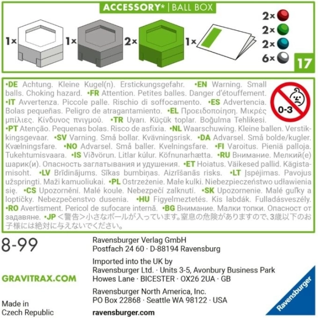 In questo set GraviTrax troverai 12 biglie colorate: 6 argento, 2 rosse, 2 blu e 2 verdi. Le biglie possono essere organizzate per colore o mescolate in base alla tua immaginazione. Il set include anche 4 scatole per organizzare le biglie - 2 verdi, 1 bianca e 1 grigia. Queste scatole possono essere impilate, il che consente uno stoccaggio anche in spazi più piccoli.