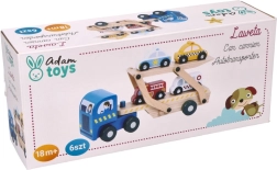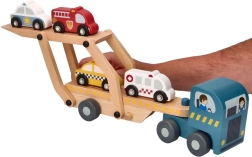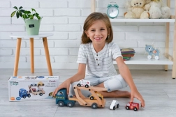 Questo trasportatore in legno offre grande divertimento per i bambini grazie alla sua varietà e lavorazione di qualità. Include un rimorchio rimovibile che ospita quattro deliziosi veicoli in legno colorati.