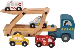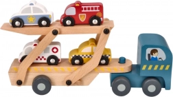 Il set comprende un'auto della polizia, un camion dei pompieri, un'ambulanza e un taxi, tutti realizzati in legno di qualità con pitture dettagliate.