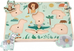 Grazie a questo puzzle sonoro i bambini apprendono non solo le forme ma anche i suoni degli animali della savana. Supporta lo sviluppo della motricità fine e della percezione uditiva.