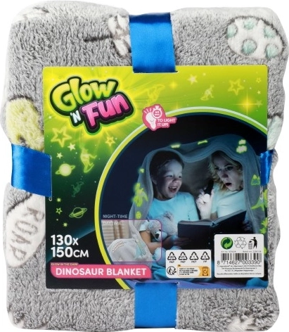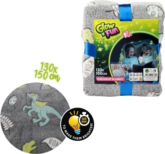 Questa coperta grigia in peluche con simpatici motivi di dinosauri illuminerà ogni sera. Per un facile effetto luminoso al buio è sufficiente una breve esposizione alla luce: più è intensa e prolungata, più forte e duraturo sarà l’effetto. Ideale per rilassarsi sul divano, per la cameretta dei bambini e anche come regalo originale.