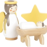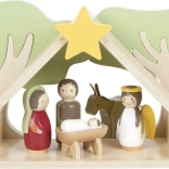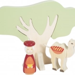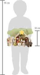 Il set include due alberelli, un tetto con stella, i tre Re Magi, un pastore, un angelo, Maria, Giuseppe, Gesù Bambino nella mangiatoia, tre cammelli, un asino, un bue e due pecore. Il presepe, alto 18 cm, è realizzato in legno di qualità ed è ideale per le tradizioni di famiglia, per sviluppare la fantasia dei bambini e come decorazione elegante sullo scaffale o sotto l'albero.