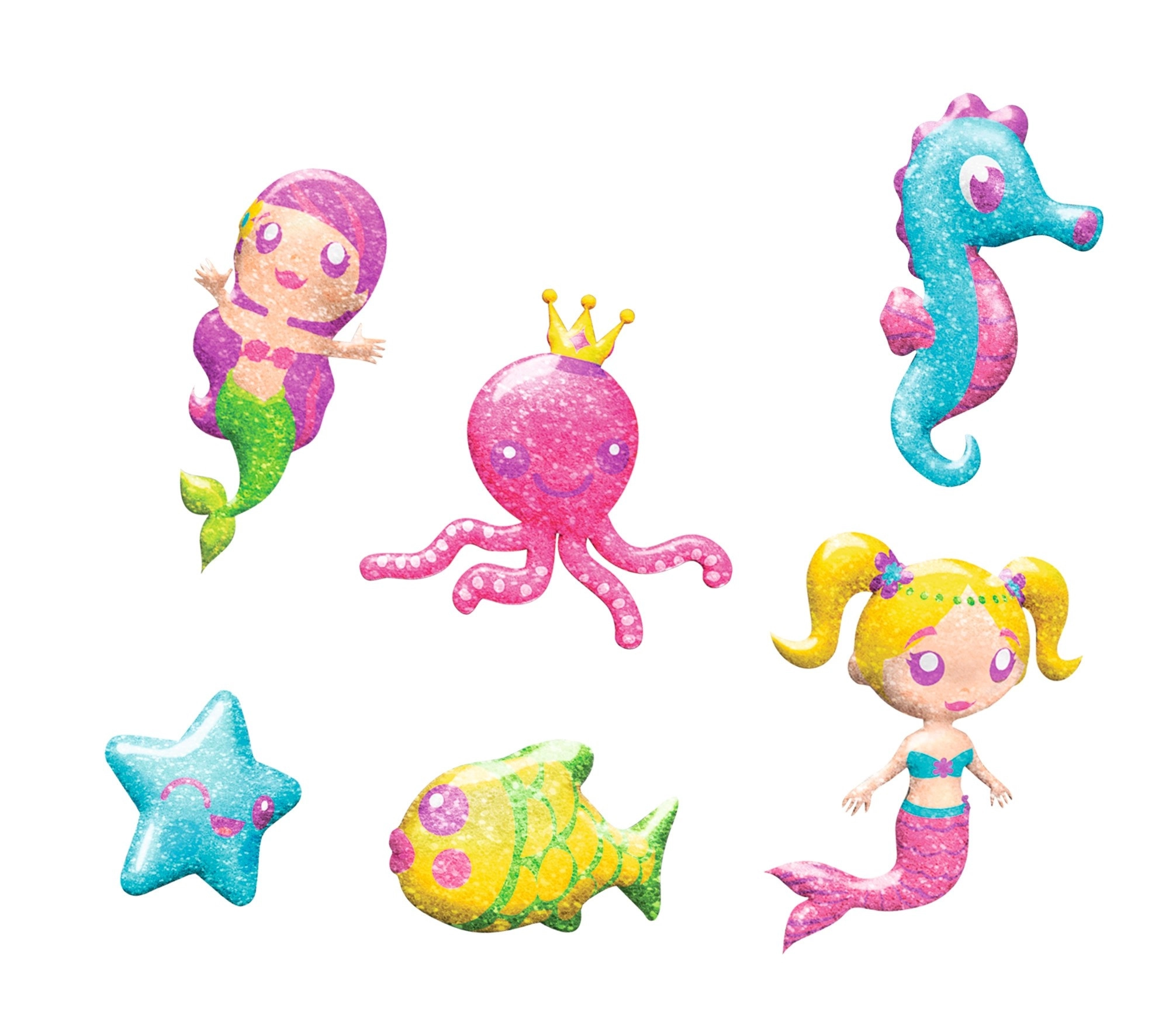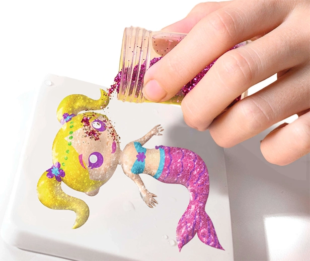 Le boccette applicatrici con beccuccio sottile facilitano la colorazione e i dettagli minuti. I glitter donano alle figure marine un affascinante bagliore.