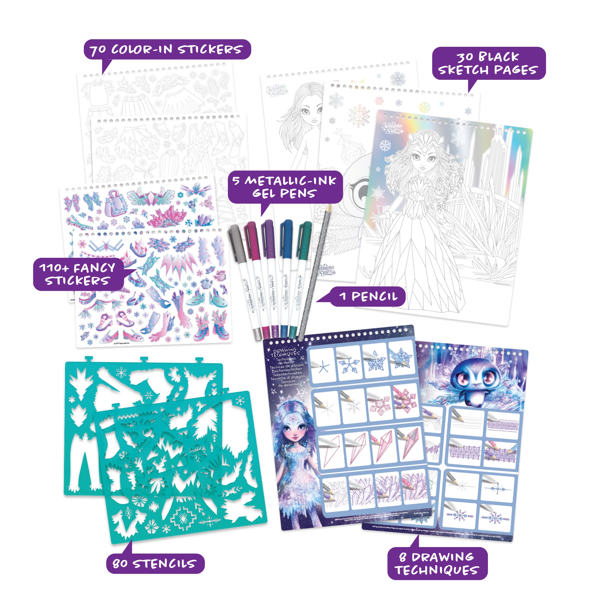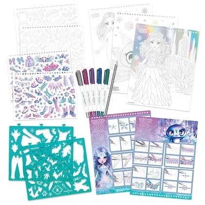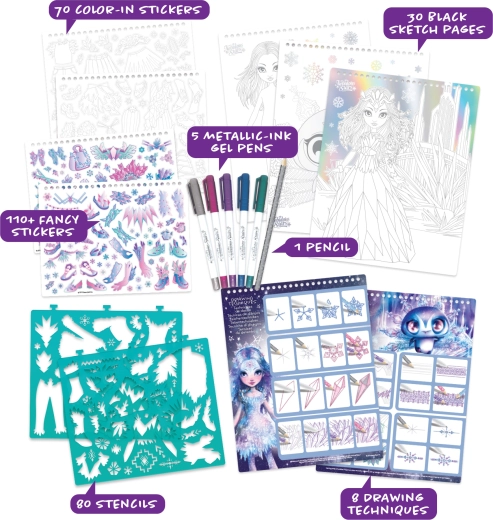 Nella confezione sono inclusi ricchi accessori: penne gel metalliche per dettagli d’effetto, stencil in plastica per contorni precisi, adesivi anche da colorare e una matita per gli schizzi. Le pagine a tema con il personaggio Iceana invitano a colorare, decorare e progettare illustrazioni personalizzate.