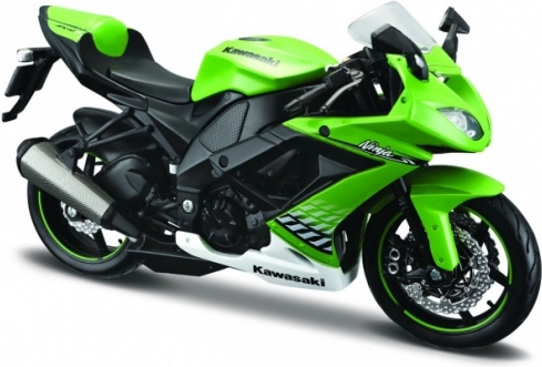 Modello di motocicletta Kawasaki Ninja ZX-10R in scala 1:12 con sospensioni mobili e supporto per una facile presentazione.