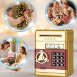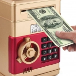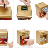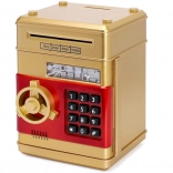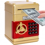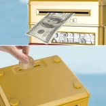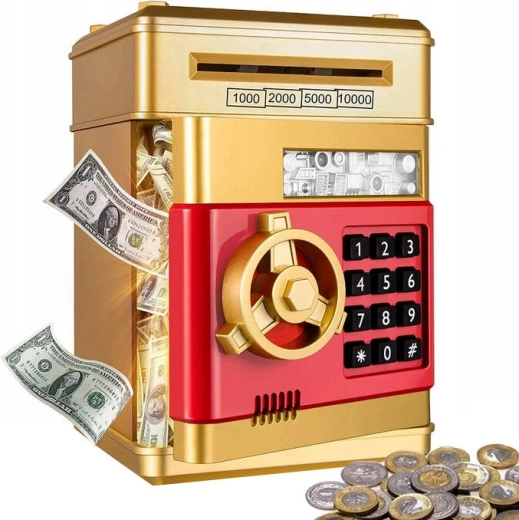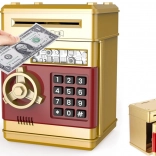 È realizzata in materiale plastico resistente di colore oro. Questo salvadanaio consente un facile inserimento di monete e banconote, e inoltre offre la possibilità di impostare un codice PIN fino a 4 cifre.