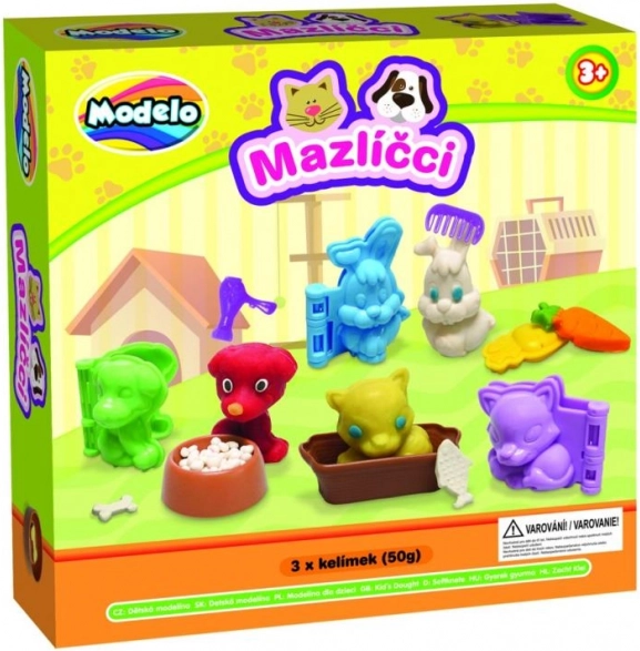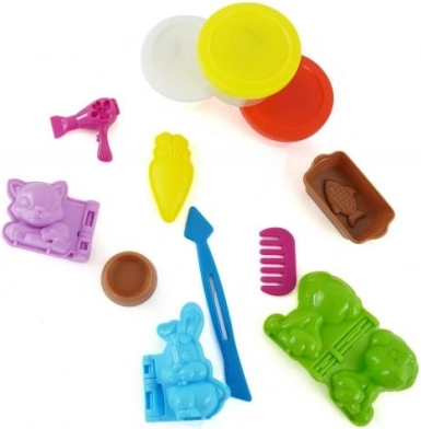 3 vasetti di pasta modellabile, 3 stampini per animali, ciotola, 2 stampini per cibo per animali, pettine, asciugacapelli e forbicine