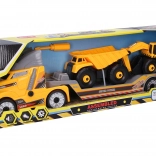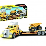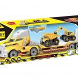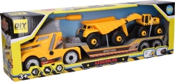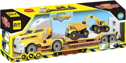 La confezione include due macchine da cantiere da 16 cm – dumper ed escavatore – trasportabili sul rimorchio. Le ruote libere garantiscono una marcia scorrevole su varie superfici e la struttura robusta è ideale per il gioco quotidiano in casa e in giardino.