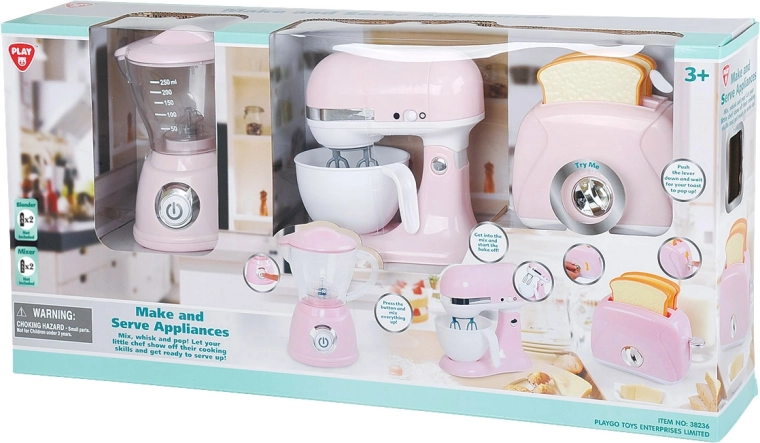 Scopri il divertente set rosa Playgo per piccoli chef: tostapane, frullatore e sbattitore. Gli apparecchi sembrano reali, hanno effetti luminosi e sonori e incoraggiano il gioco creativo e lo sviluppo delle abilità. Ideale per la cucina dei bambini a partire dai 3 anni.