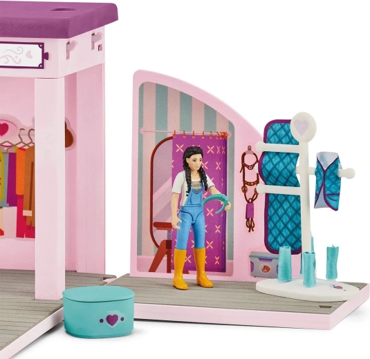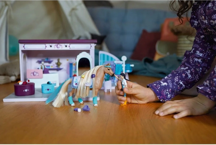 Il salone pieghevole per cavalli dalla collezione Schleich HORSE CLUB Sofia's Beauties è ideale per tutti gli amanti dei cavalli. Offre coperte e accessori fantastici in diversi colori, quindi ogni cavallo avrà il suo preferito. Sai che puoi non solo pettinare e acconciare la criniera e la coda dei cavalli, ma anche facilmente sostituirli? Grazie a questo, Sofia e la sua cavalla non devono rimanere con un solo look. È perfetto per qualsiasi evento fotografico, anche se solo nel cortile. Il set si piega facilmente e si apre di nuovo per i viaggi.