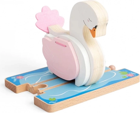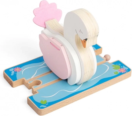 Magico tunnel in legno a forma di cigno che trasforma ogni ferrovietta in un laghetto fiabesco con onde e ninfee. Le ali apribili creano un passaggio per il trenino, mentre la lavorazione in legno di qualità e la compatibilità con la maggior parte delle ferrovie in legno garantiscono tanto divertimento. Sostiene fantasia, motricità fine e coordinazione. Il trenino non è incluso nella confezione.