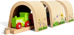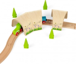 Questo tunnel universale per trenini in legno trasforma facilmente qualsiasi tracciato. Puoi usarlo come semplice passaggio dritto con rotazione di 180° oppure combinare più pezzi per creare un arco scorrevole, ideale anche per binari curvi lunghi. Grazie alla superficie liscia e ai bordi arrotondati è sicuro e gradevole al tatto.