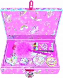 Questo set incantato unisce divertimento e ordine: i bambini possono custodire i loro segreti nel portagioie con chiusura e scrivere lettere o biglietti con il set di cancelleria. Il delicato motivo degli unicorni conquisterà tutti gli amanti delle storie magiche e dei colori pastello.