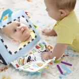 - Gioco sensoriale su tutti i lati: grande specchio per esplorare il viso, pannello frusciante, morbide etichette pendenti e motivi a contrasto