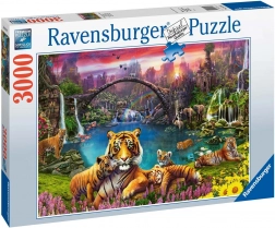 La scatola del puzzle mostra una scena con tigri in un paesaggio vibrante pieno di verde e animali selvatici.