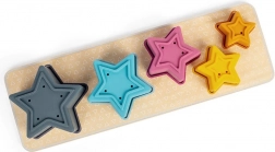 Questo intelligente gioco educativo unisce una base in legno a cinque stelle in silicone colorate. Ogni stella ha un numero diverso di fori, creando un divertente effetto di piccole fontanelle durante il gioco con l’acqua. I bambini allenano la coordinazione occhio–mano, la classificazione per dimensione e colore e il pensiero logico.