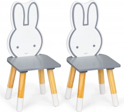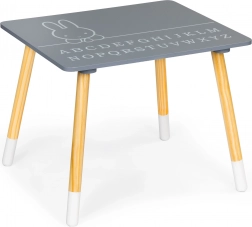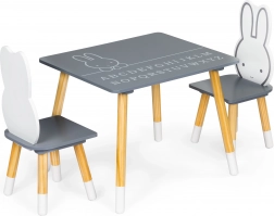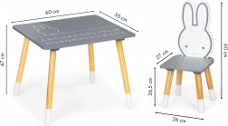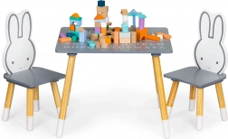 Questo splendido set di mobili per bambini include un tavolo con piano grigio e alfabeto e due sedie con schienali a forma di coniglio. Ideale per giocare, imparare o come zona pranzo autonoma per i bambini.