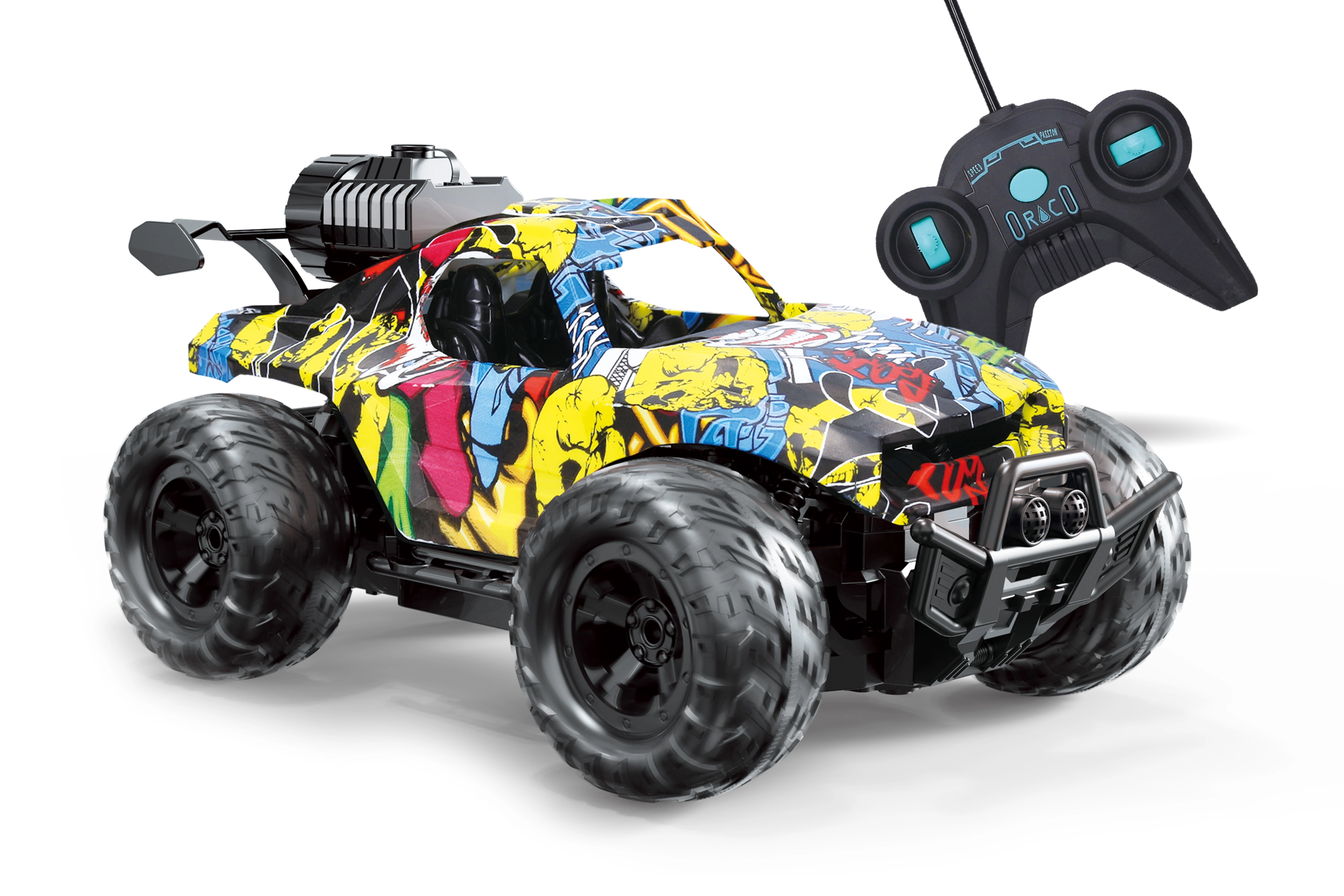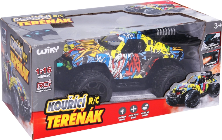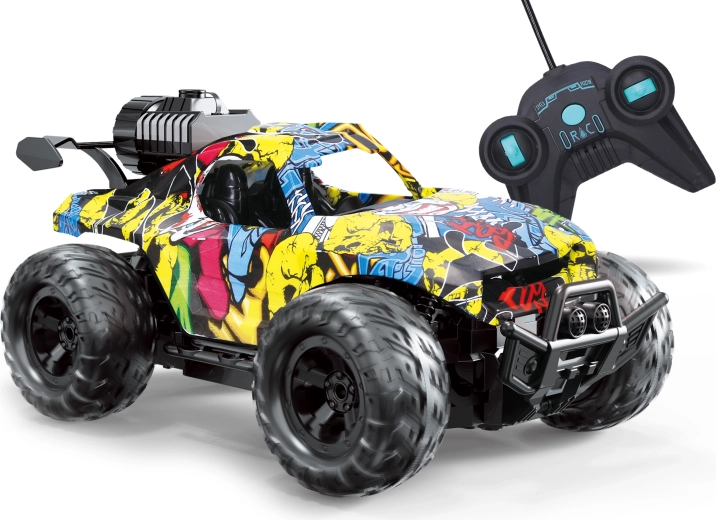 Questa auto RC fuoristrada in cool stile graffiti offre tanto divertimento grazie alla combinazione di effetti luminosi ed effetti fumo. Il fumo si attiva con un pulsante sul radiocomando e risulta realistico grazie al facile rabbocco dell’acqua nel serbatoio. Con dimensioni di 24 × 14,5 × 10,6 cm si maneggia alla grande ed è adatta a principianti e piccoli piloti.