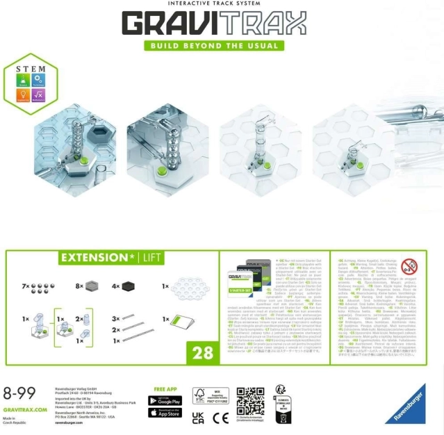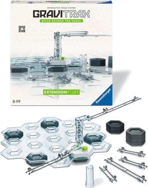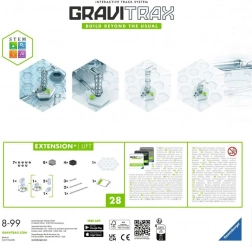 Il set aggiuntivo con ascensore è un kit di rotaie supplementari e un ascensore che ampliano e rendono più varia la pista, consentendo di trasportare anche più biglie contemporaneamente!