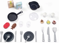 Questo set di cucina include un lavello con rubinetto, un frigorifero e una macchina per caffè espresso con capsule per tè e caffè. Inoltre, il set comprende modelli realistici di cibo come carne e pesce, con due lati diversi, crudo e fritto. Accessori estesi includono anche pentola con coperchio, piatti, posate, stoviglie e altro. Tutto può essere facilmente riposto sugli scaffali pratici o utilizzare il piccolo tavolo per giocare.