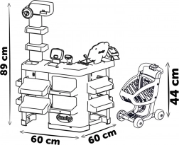 Supermercato con cassa, reparto frutta/verdura, bilancia (nuova bilancia meccanica: il peso visualizzato si aggiorna in base agli alimenti pesati). Il bambino può impostare l’orologio e il pannello aperto/chiuso. Include 42 accessori: pasta, biscotti, cereali, latte, 6 pezzi di frutta e verdura, 1 torta, 2 macarons, 2 lattine, 1 lettore di codici a barre elettronico con suono e luce, 1 carta di credito, 4 scontrini, 9 monete e 12 banconote. La cassa ha un cassetto portadenaro, un microfono e un lettore di carte di credito. Carrello incluso.