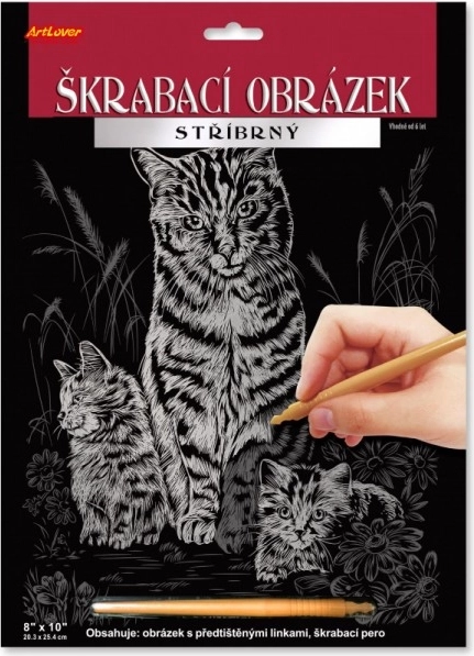 Scopri il disegno da grattare ARTLOVER con motivo di gatto con gattini, che, una volta grattato, rivela un effetto argento. Formato 20 × 25 cm, nella confezione penna da grattare in plastica (14 cm). Ottimo passatempo creativo dai 6 anni e utile per lo sviluppo della motricità fine.