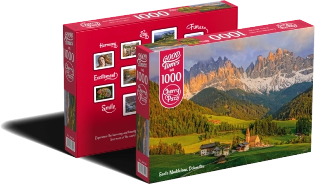 Goditi i panorami delle Dolomiti con il puzzle CHERRY PAZZI da 1000 pezzi a tema Santa Maddalena. Una volta completato misura 70 × 50 cm – ideale per relax, allenamento della pazienza e come decorazione.