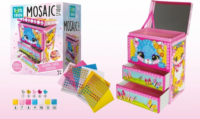 La scatolina con due cassetti è il luogo ideale per riporre piccoli oggetti preziosi. Il divertimento sta nel decorarla da soli. Basta abbinare gli elementi colorati ai numeri corrispondenti e godersi il risultato del proprio lavoro creativo. La scatola è inoltre dotata di uno specchietto, posizionato sul lato interno del coperchio.