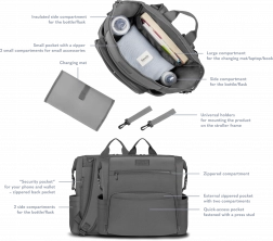 L'organizzazione studiata offre accesso rapido a tutto il necessario per il bebè e per i genitori. Le fibbie universali permettono un facile fissaggio al passeggino e le cinghie ausiliarie regolano le dimensioni in modo che lo zaino entri anche sotto il sedile in aereo.