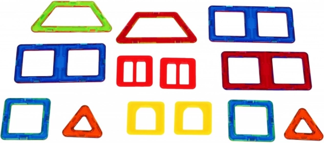 - Contenuto del set: 9 pezzi magnetici (3x rettangolo, 2x triangolo, 2x trapezio, 2x quadrato) + 4 inserti in plastica (quadrati con aperture), campionario di modelli e confezione regalo colorata.