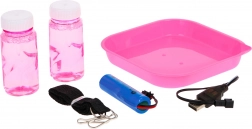 Nella confezione trovi una batteria da 3,7 V, cavo USB, 2× soluzione, ciotolina, cordino e adesivi – tutto per giocare subito.