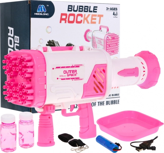 - Pistola per bolle, 2× soluzione, batteria 3,7 V, adesivi, cordino, cavo di ricarica USB, ciotolina per la soluzione