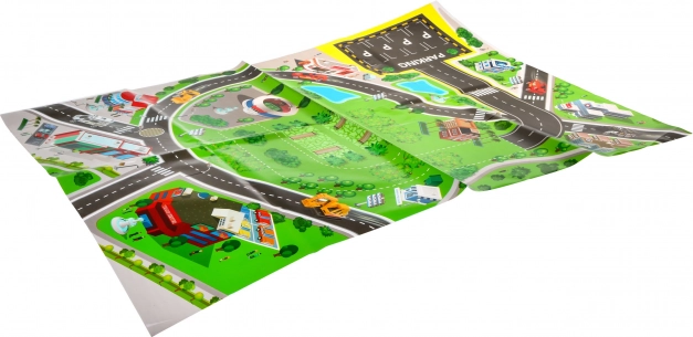 Il tappetino di circa 78 × 58 cm raffigura strade, parcheggi ed edifici – ideale per imparare le basi delle situazioni del traffico.