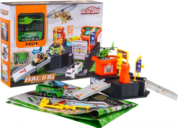 Inclusi macchinina, elicottero, segnaletica e adesivi. Il set da 22 pezzi è pronto all’azione appena tolto dalla scatola.