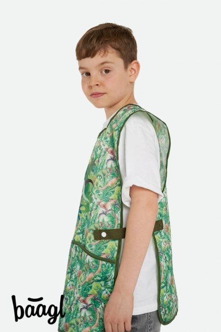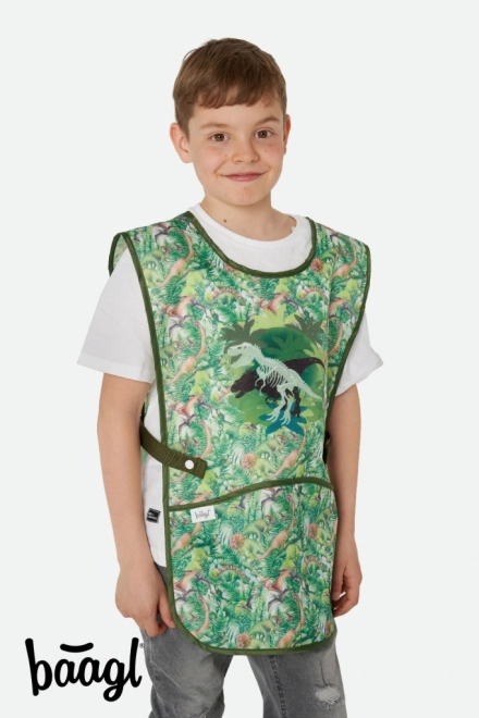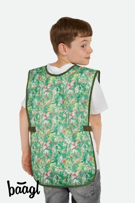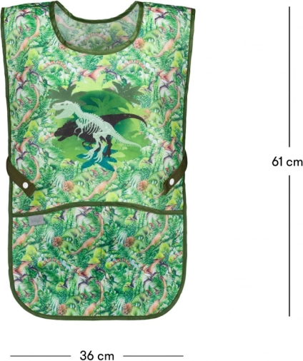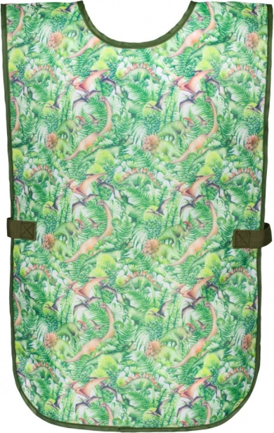 Questo grembiule si distingue per la sua grafica colorata che include un motivo divertente di dinosauri e giungla.
