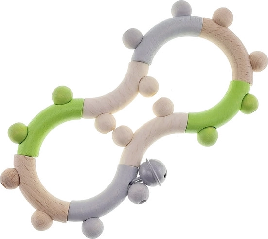 Questo sonaglio in legno di alta qualità del marchio Hess combina materiale naturale con delicate tonalità pastello e un design originale. Otto elementi in legno infilati su una cordicella elastica offrono un gioco sicuro che stimola tatto, udito e coordinazione mano–occhio.