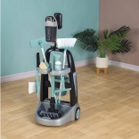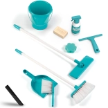 Il carrello include scopetta, mocio, paletta, scopa, secchio, spugna e detergenti, che coinvolgono pienamente i bambini nelle attività di pulizia immaginaria.