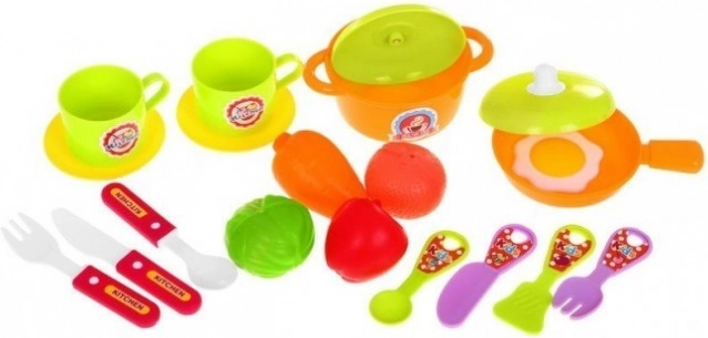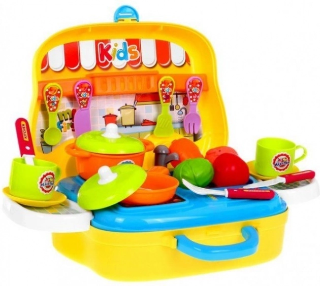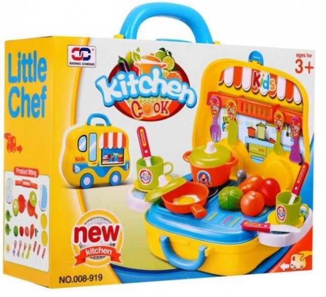 - Valigetta pieghevole a forma di automobilina, piano di lavoro con imitazione della piastra a induzione, 2 mensoline laterali, gancio appendi‑utensili, pentola con coperchio, padella con coperchio, 2 piattini, 2 bicchieri, 2 forchette (piccola e grande), 2 cucchiaini (piccolo e grande), 2 coltelli (piccolo e grande), spatola, rubinetto, 4 pezzi di verdura/frutta (peperone, carota, cavolo, arancia), uovo al tegamino, confezione regalo colorata