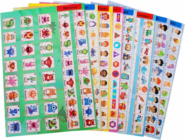 Carta illustrate con categorie (volti, forme, trasporti, famiglia, mostriciattoli) favoriscono lo sviluppo del vocabolario, dell’attenzione e della capacità di creare associazioni.