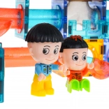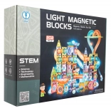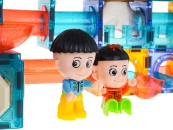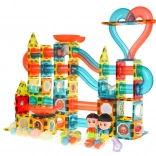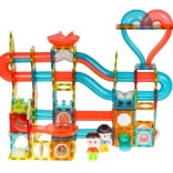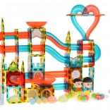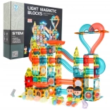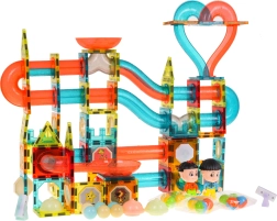 Set di costruzioni magnetiche per bambini dai 3 anni. Contiene 202 pezzi e consente di costruire una pista per biglie in qualsiasi configurazione. Alcune parti sono alimentate a batteria: una volta accese, illuminano la pista con luci pulsanti rendendo il gioco ancora più divertente. Le luci lampeggiano in 3 modalità: veloce, media e lenta - è possibile scegliere quella più adatta al bambino. Alcune biglie lampeggiano dopo essere state agitate. Il set include anche capsule colorate che cambiano colore e due riflettori LED. Alimentazione: 18 x 1,5V LR1130, 12 x 1,5V LR41, 8 x 3V CR1220 (batterie incluse).