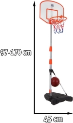 | - tabellone circa 43 cm x 33 cm, - diametro del cerchio circa 30 cm, 24 cm, - altezza del set da circa 97 cm a 170 cm, - diametro della palla gonfiata circa 14 cm. |
