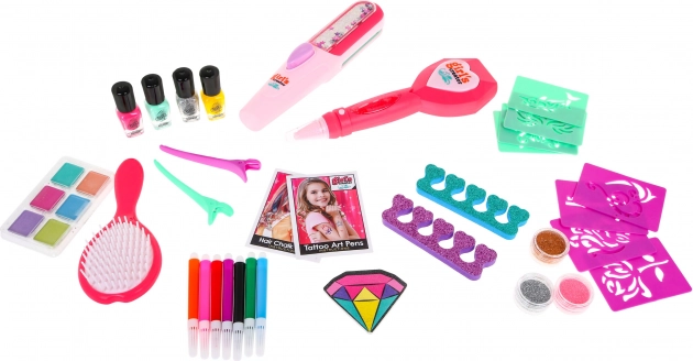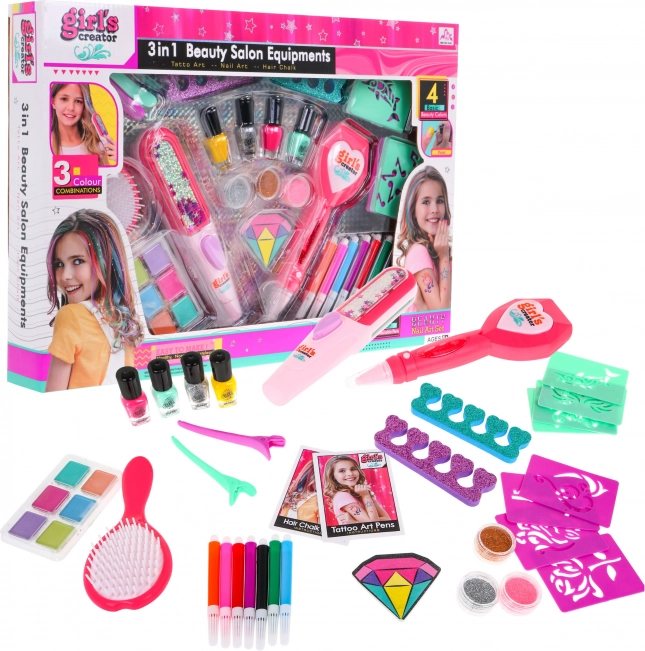 Set 3 in 1 meraviglioso per ragazze è ideale per styling creativo di capelli colorati, manicure e tatuaggi. Questo set combina accessori cosmetici sicuri e non tossici, che possono essere facilmente rimossi alla fine del divertimento.