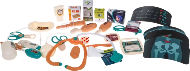 Il set include strumenti medici indispensabili come maschera per ossigeno, stetoscopio, siringa e altro.
